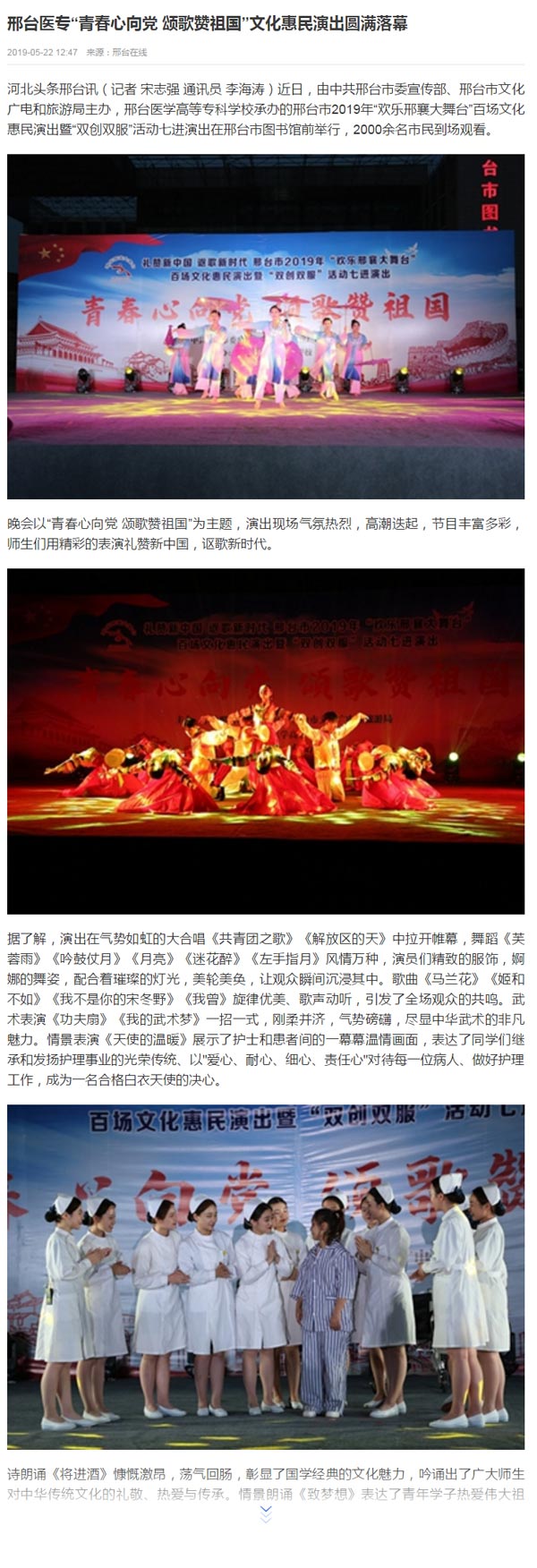上一条:河北教育网报道“邢台医学高等专科学校为党员过‘政治生日’”