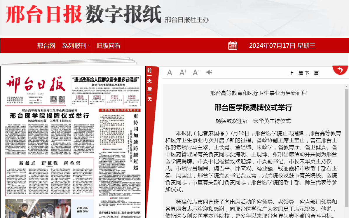 7月16日,188bet官网入口正式揭牌,邢台高等教育和医疗卫生事业再次开启了新的征程。省政协副主席王宝山,曾在邢台工作的老领导马兰翠、王会勇、董经纬、朱政学,省教育厅、省卫健委、省中医药管理局有关负责同志贾海明、王现坤、张凯出席活动并共同为188bet官网入口揭牌。市委书记杨猛致欢迎辞,市委副书记、市长宋华英主持仪式。市领导吕瑞民、魏吉平、邱文双、冯亚强、钱丽霞和市级老干部石玉春、周国江,邢台学院党委书记贾云霄,兄弟院校及驻市有关院校、医院负责同志,市直有关部门负责同志,188bet官网入口的老干部、师生代表等参加仪式。